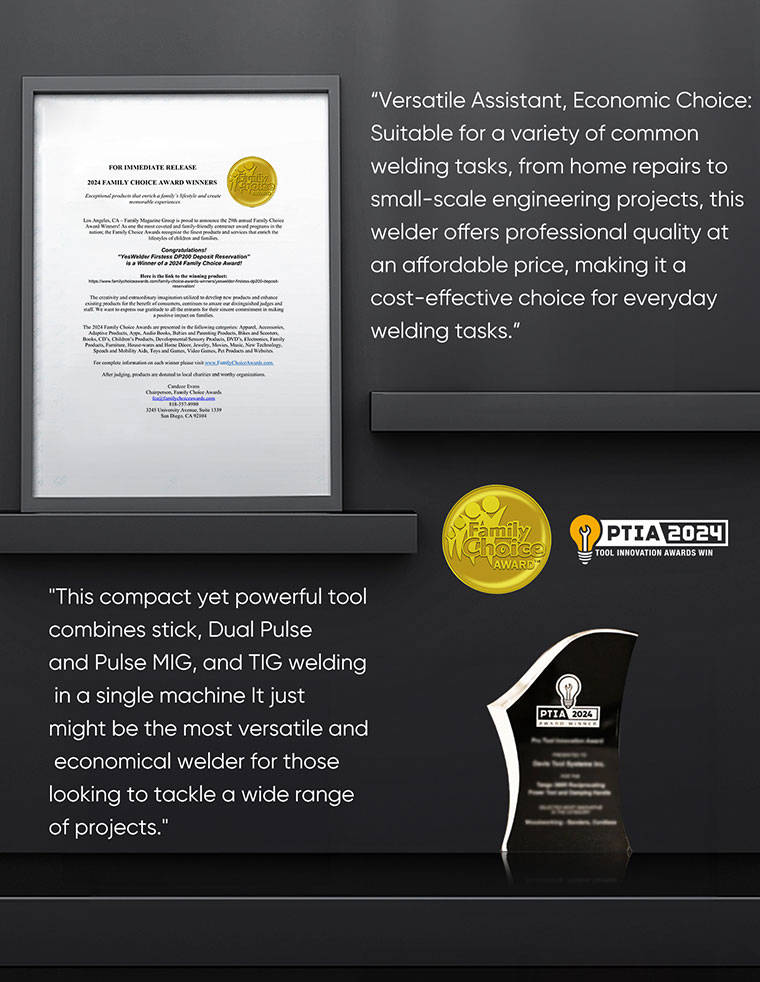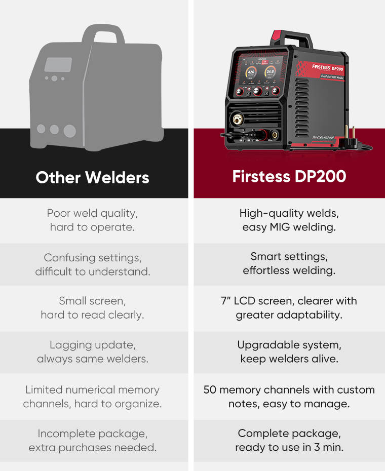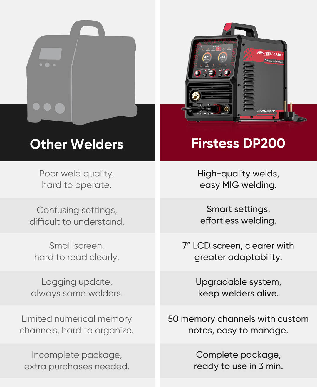 The Firstess DP200 welding machine offers MIG, Flux-Cored, DC Lift TIG, and Stick welding with dual voltage (120V/240V). It features Dual Pulse Mode, smart parameter matching, and spool gun compatibility, making it versatile and easy to use. Plus, it supports system upgrades for future enhancements. Perfect for all skill levels!