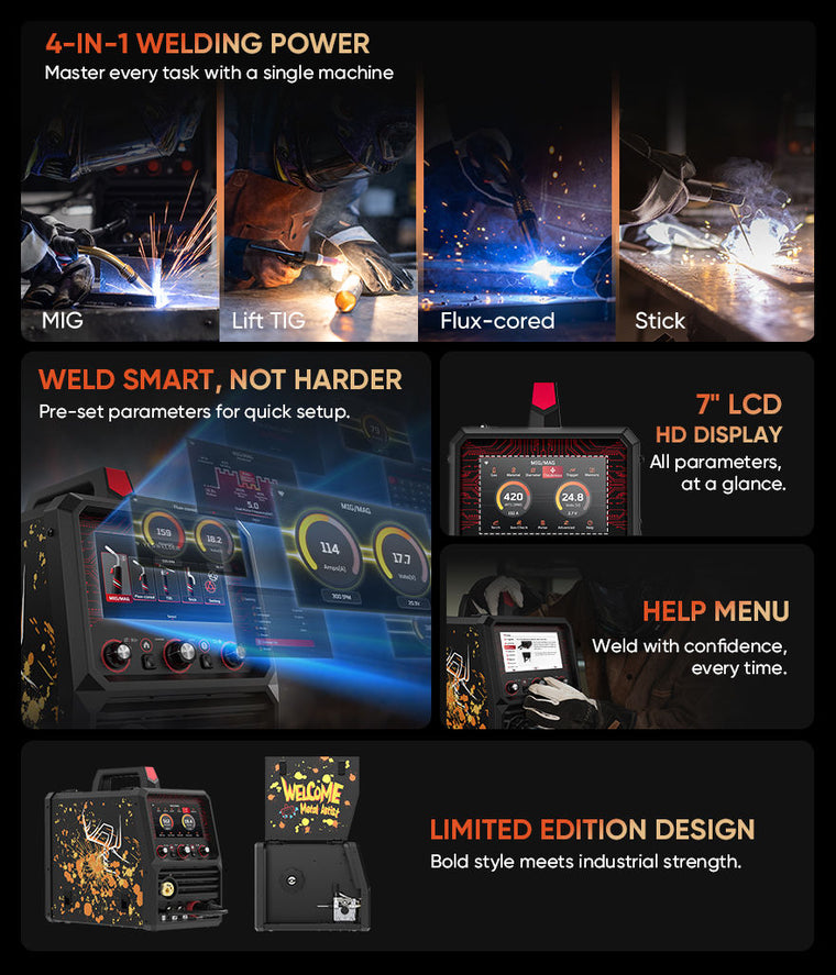 - Multi-Process Welding: Supports MIG, Flux, DC Lift TIG, and Stick welding for versatility across applications.