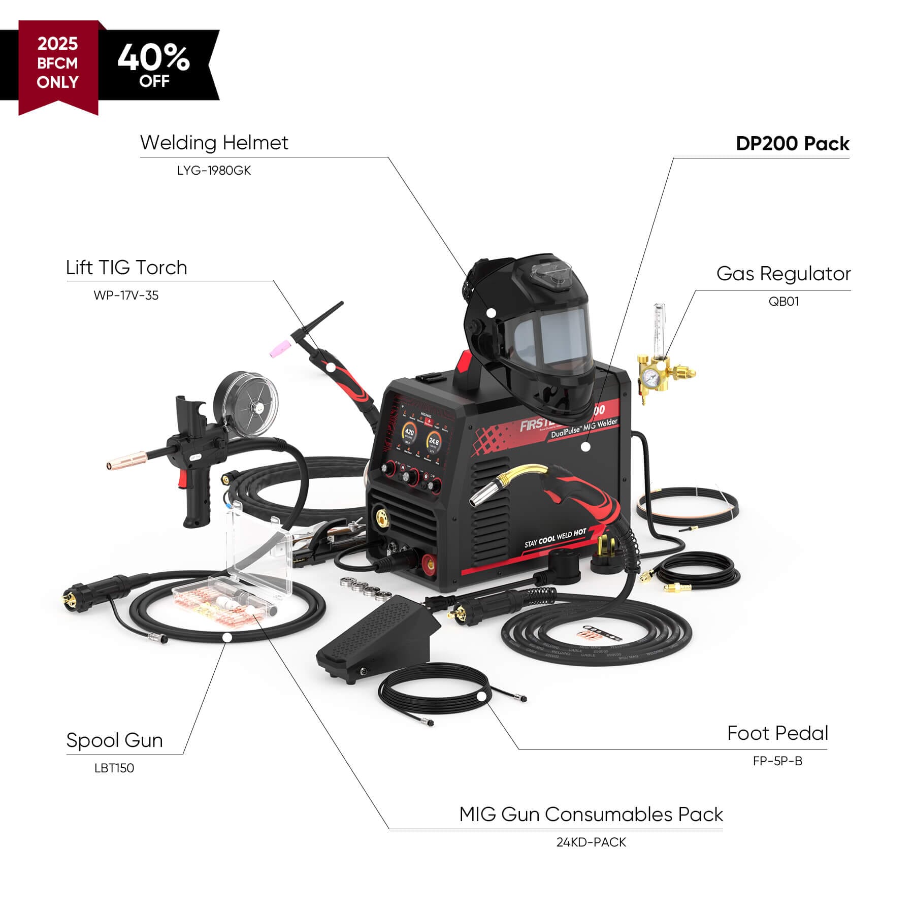 The Firstess DP200 welding machine offers MIG, Flux-Cored, Lift TIG, and Stick welding with dual voltage (120V/240V). It features Dual Pulse Mode, smart parameter matching, and spool gun compatibility, making it versatile and easy to use. Plus, it supports system upgrades for future enhancements. Perfect for all skill levels!